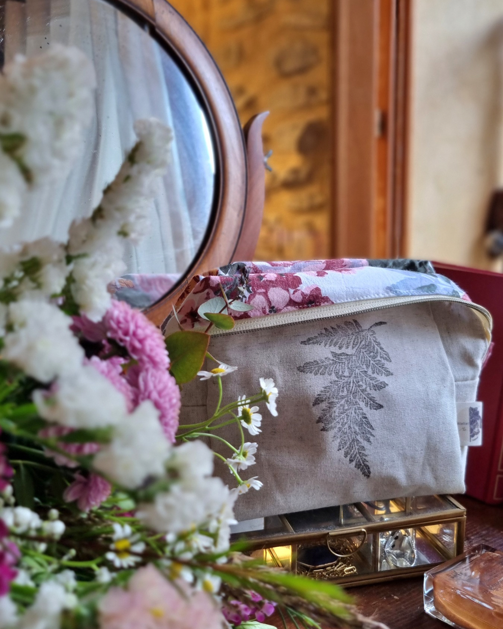 On y retrouve des fougères, des tulipes, des fleurs sauvages... mais aussi une petite référence à l’art nouveau avec des fleurs stylisées. Les tissus intérieurs, chinés et upcyclés avec soin ajoutent un charme unique, un petit monde intérieur discret et poétique.