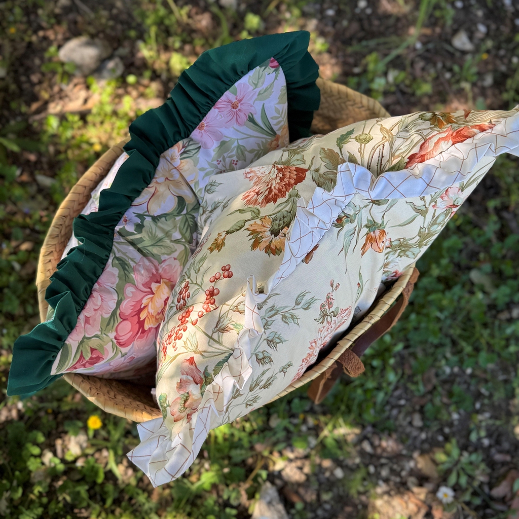 Dans cette collection printanière, les fleurs sont donc à l'honneur. Les créations sont réalisées à partir de tissus floraux chinés et ornées de jolis médaillons qui, comme un tableau, mettent à l'honneur quelques joies du printemps, les jacinthes des prés, les coquelicots, les marguerites et enfin les petits escargots.